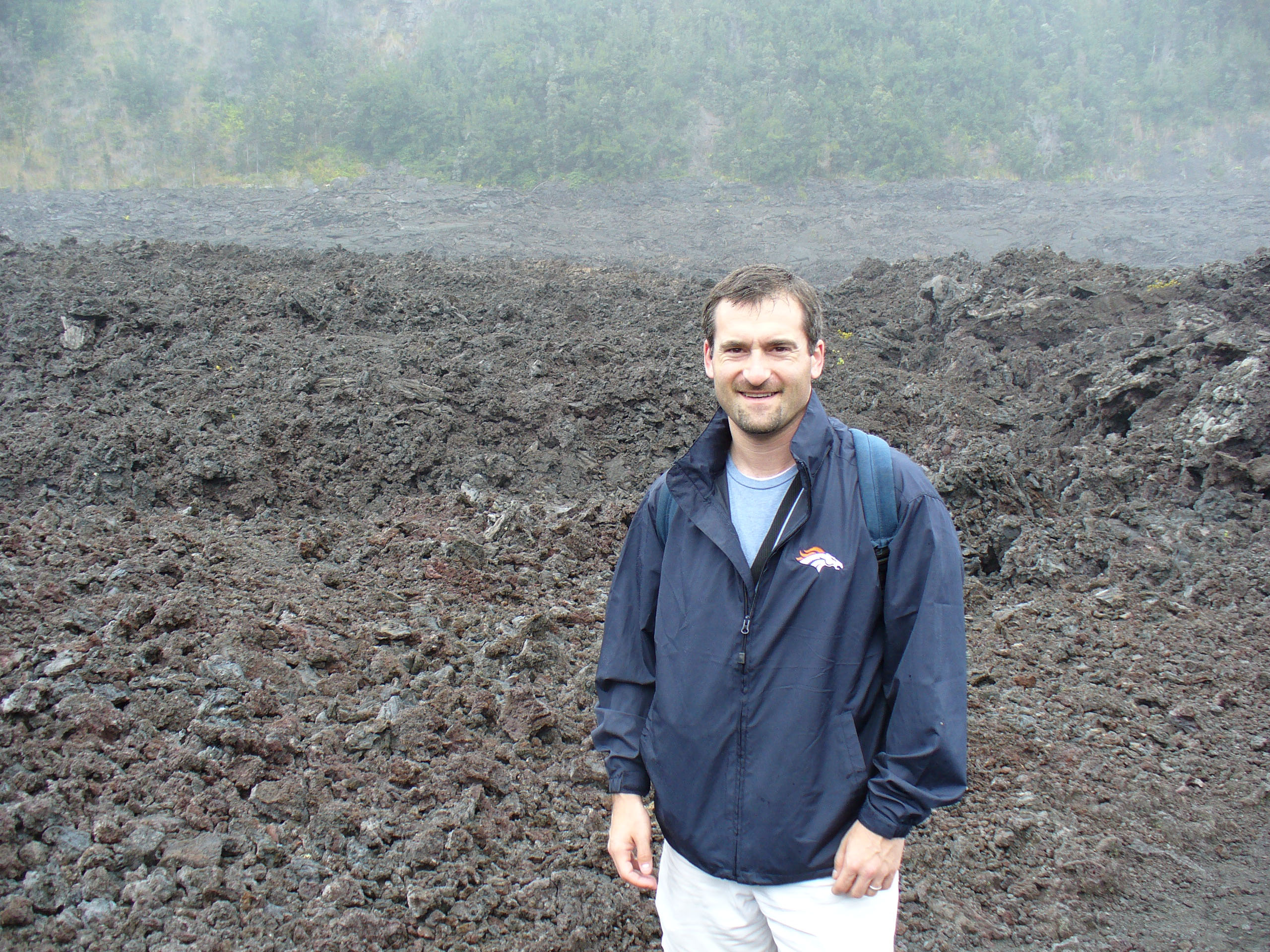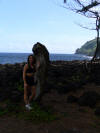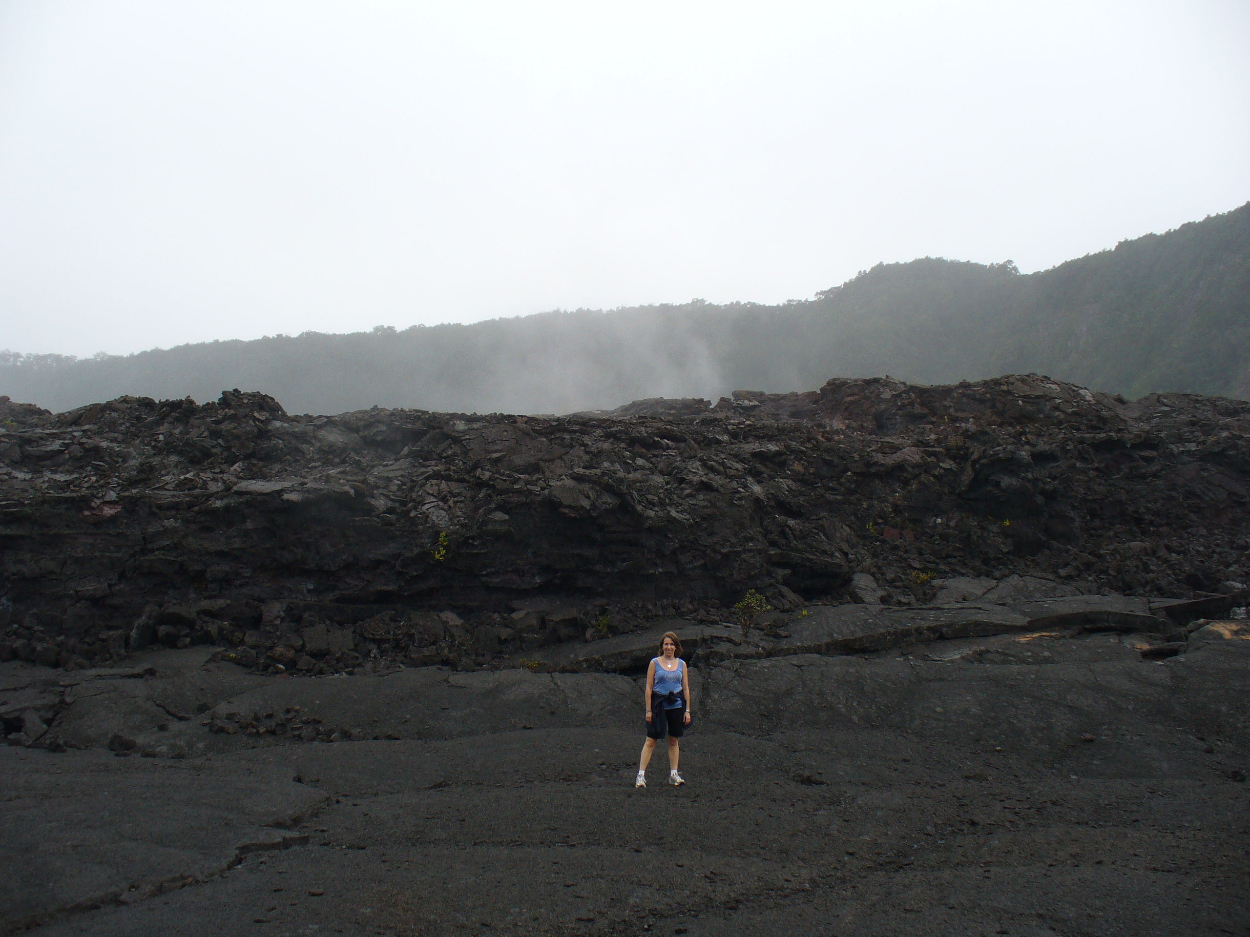 Julie, also in a volcanic crater, standing in front of a huge, steaming pile
